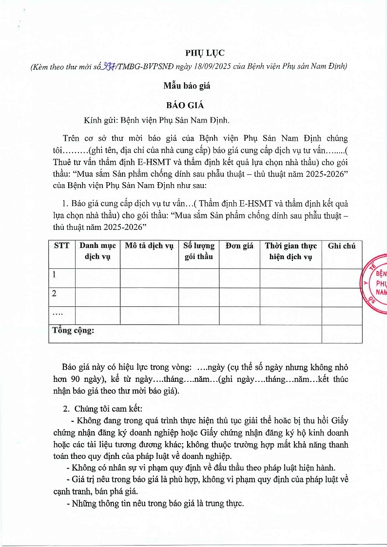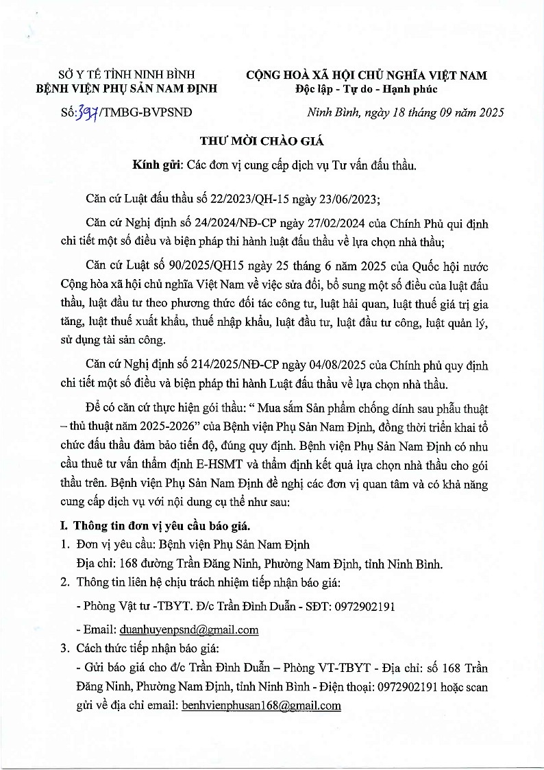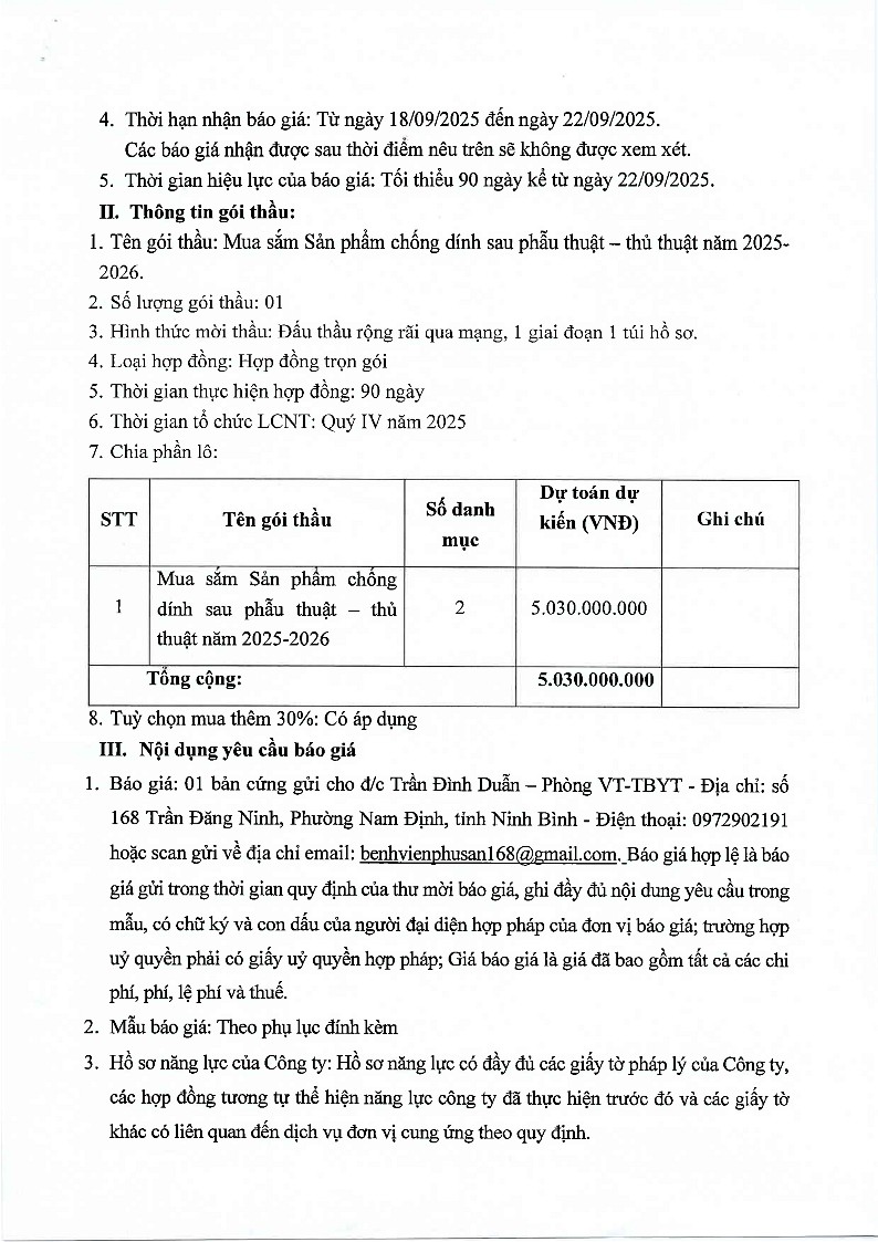 MỜI BÁO GIÁ CUNG CẤP DỊCH VỤ TƯ VẤN ĐẤU THẦU SẢN PHẨM CHỐNG DÍNH SAU PHÃU THUẬT