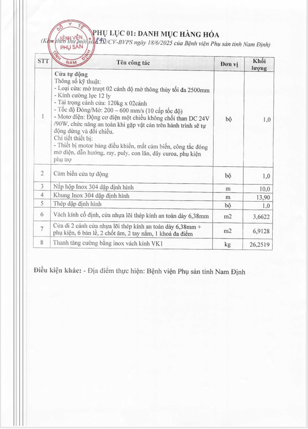 Kính gửi các đơn vị: Bệnh viện phụ sản tỉnh Nam Định có nhu cầu tiếp nhận báo giá để tham khảo, xây dựng gói thầu cung cấp, lắp đặt cửa tự động, cửa nhựa lõi thép chi tiết trong công văn kèm theo.