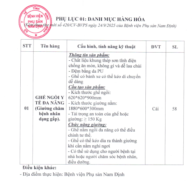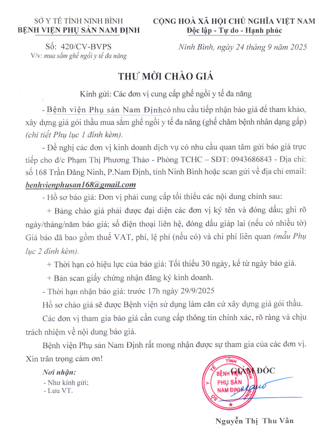 THƯ MỜI CHÀO GIÁ GHẾ NGỒI Y TẾ ĐA NĂNG VÀ TRIỂN KHAI GIƯỜNG ĐIỀU TRỊ THEO YÊU CẦU (PHÒNG GIA ĐÌNH)