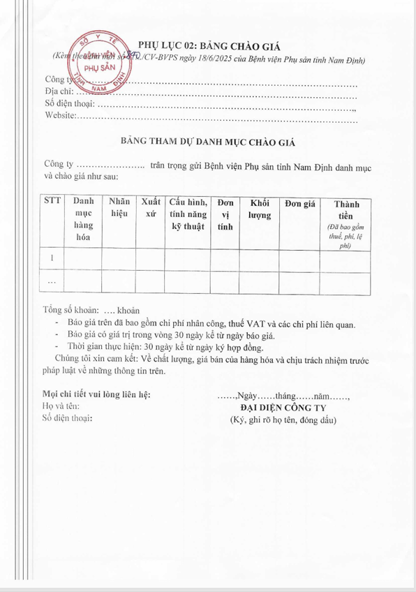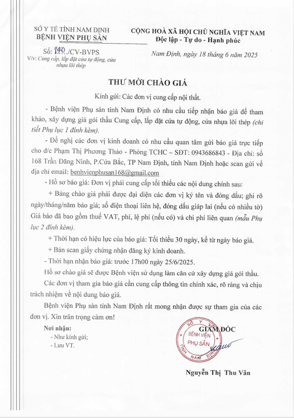 Kính gửi các đơn vị: Bệnh viện phụ sản tỉnh Nam Định có nhu cầu tiếp nhận báo giá để tham khảo, xây dựng gói thầu cung cấp, lắp đặt cửa tự động, cửa nhựa lõi thép chi tiết trong công văn kèm theo.